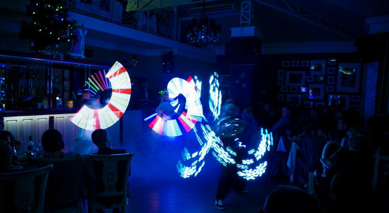 Стоимость огненного шоу "Светодиодная" включает в себя: 3 человека, продолжительность программы 5 минут, дым машина, светодиодный реквизит с вашим логотипом - от 12 500р.