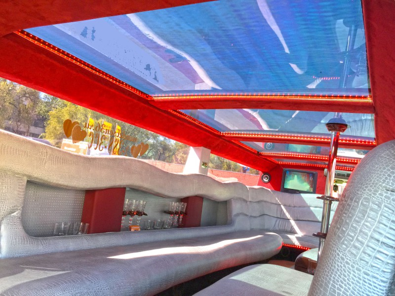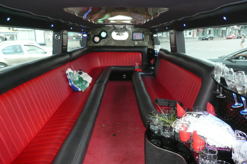 Цвет - черный. Вместимость - от 16 до 18 мест. Оборудован: кондиционером, TV. Салон: черно-красная кожа, бар, звездное небо.